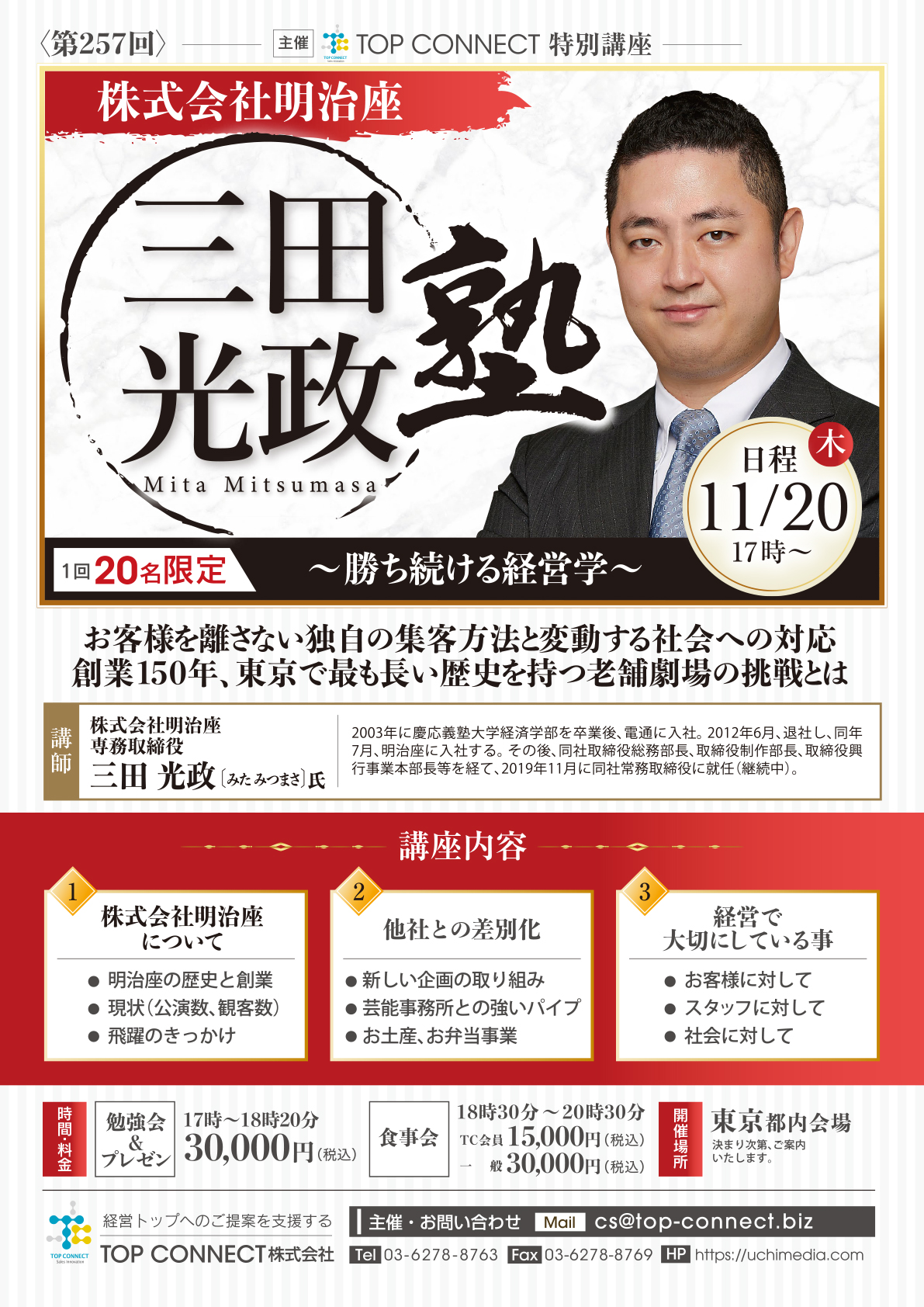 【特別講座】三田光政塾 JUKU 【11月20日(木)開催】〜勝ち続ける経営学〜お客様を離さない独自の集客方法と変動する社会への対応創業150年、東京で最も長い歴史を持つ老舗劇場の挑戦とは Post navigation 前の記事 関連記事 【特別講座】森本宏一塾 【特別講座】刀禰真之介塾 ★終了★【特別講座】佐藤竜也塾 ★終了★【特別講座】松田塾 ★終了★【特別講座】伊藤塾 ★終了★【特別講座】江幡塾 ★終了★【特別講座】杉原章郎塾 ★終了★【特別講座】元谷拓塾 ★終了★【特別講座】中島武塾