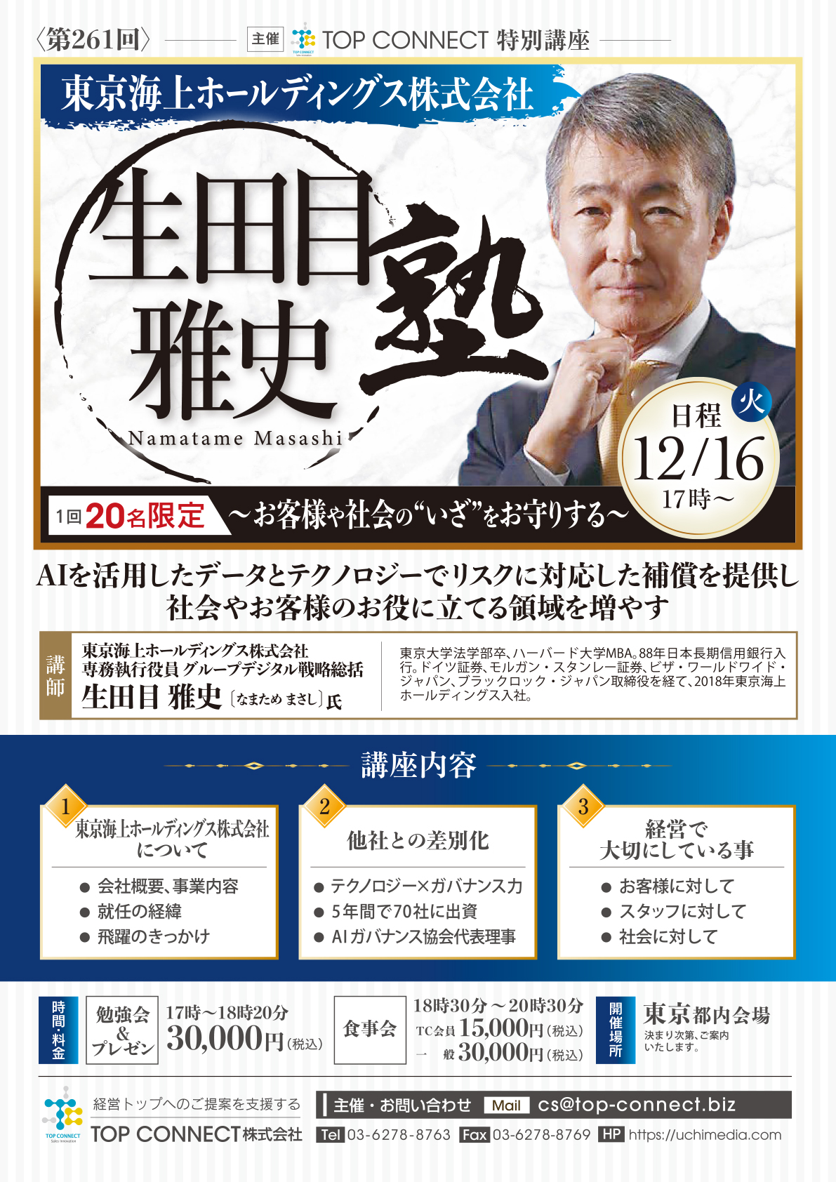 【特別講座】生田目雅史塾 JUKU 【12月16日(火)開催】〜お客様や社会の”いざ”をお守りする〜AIを活用したデータとテクノロジーでリスクに対応した補償を提供し社会やお客様のお役に立てる領域を増やす Post navigation 前の記事 次の記事 関連記事 【特別講座】杉浦元塾 【特別講座】小島秀毅塾 【特別講座】筑井信行塾 【特別講座】三田光政塾 【特別講座】森本宏一塾 ★終了★【特別講座】刀禰真之介塾 ★終了★【特別講座】佐藤竜也塾 ★終了★【特別講座】松田塾 ★終了★【特別講座】伊藤塾